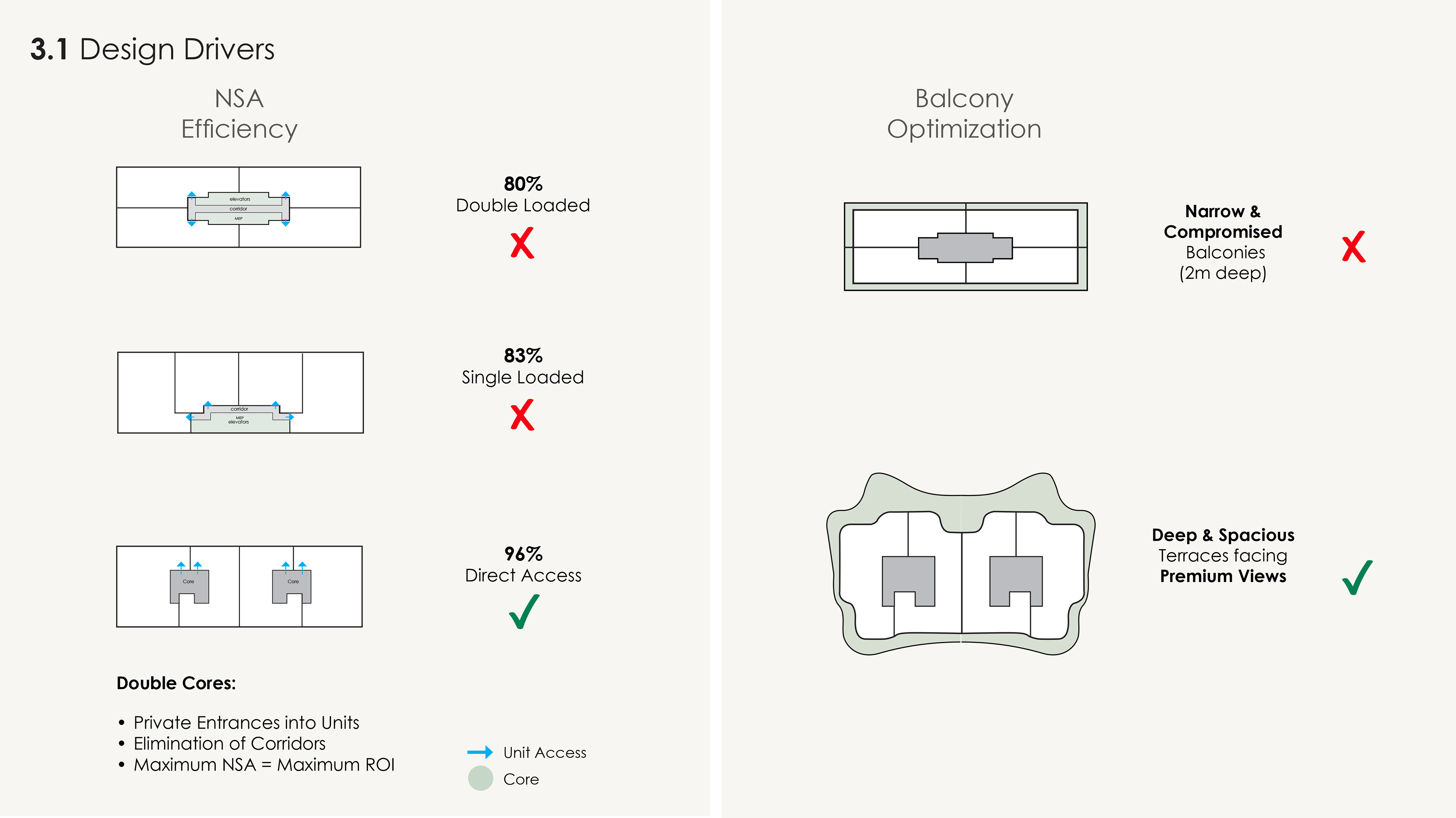 By comparing these factors, the prospective client can determine the best combination that aligns with their needs—whether prioritizing maximizing units, ensuring spacious layouts, or balancing both for optimal investment and functionality.