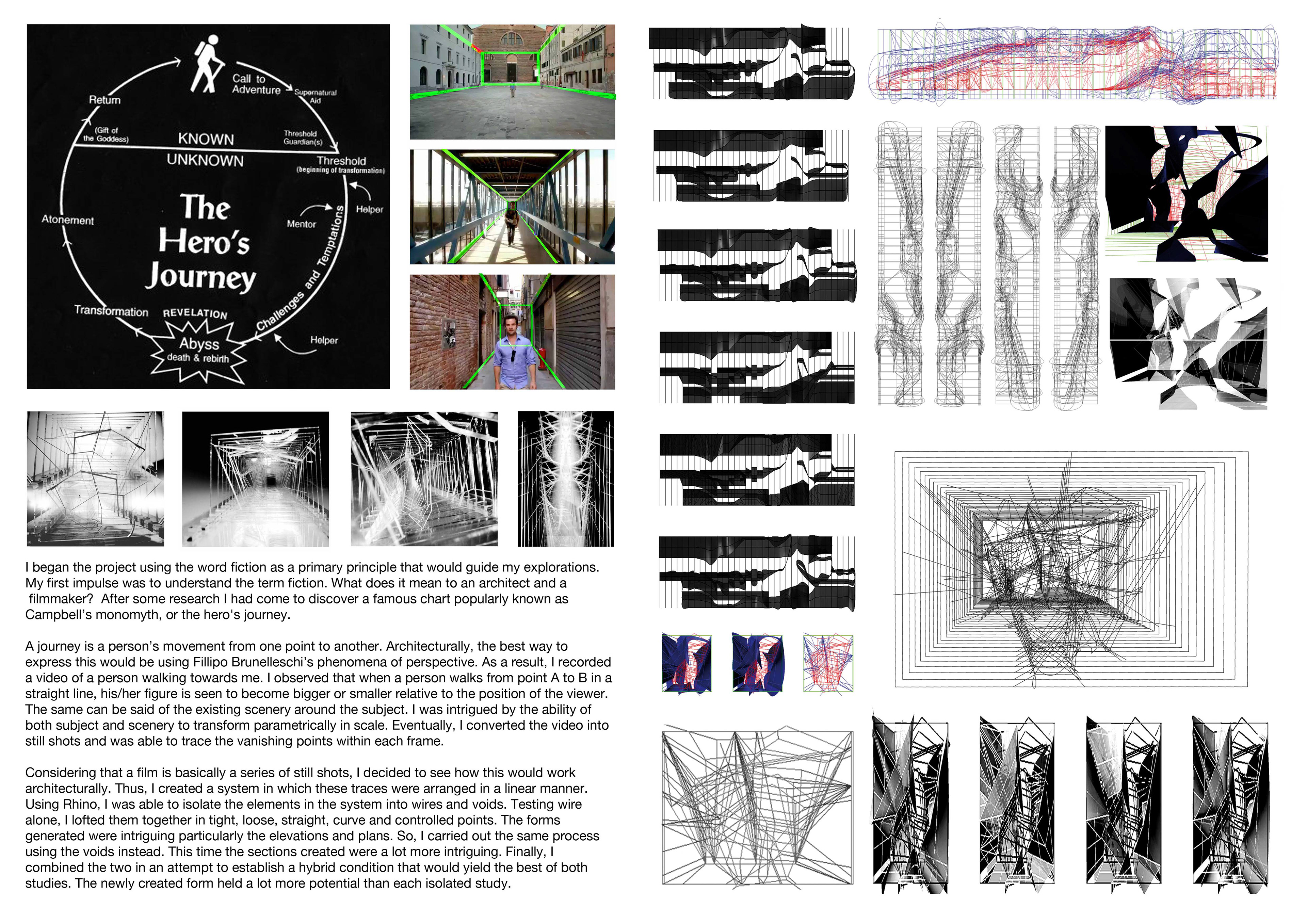 I had used a film structure to define theexperience within an architectural project. Could I create a narrative usingarchitectural elements alone? Therefore, I decided to tell the hero’s journeyusing my vanishing point machine. The video shows a journey through an unknowntunnel like space. Occasionally, obstacles interrupt this steady movement. Graduallygaining pace, the movement transforms into an aggressive back and forth motionto signal conflict with the struggle intensifying in a more complicated space.